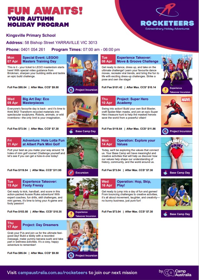 Mon 28th Apr | Year 5 Reach Incursion Year 6 Huddle Excurion - Group 1 | |