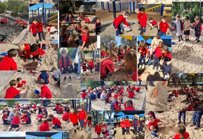 The children had a focus the sound ‘v’—a volcano! They collaborated to build a volcano in the sandpit, adding sand until it reached the desired height, then creating a hole for the "lava."