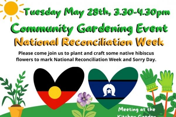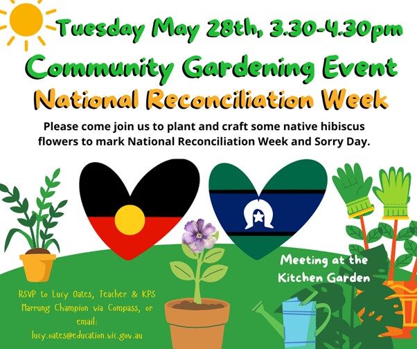 Please come join us after school on Tuesday 28th May to help plant and create Native Hibiscus flowers to mark Sorry Day and National Reconciliation Week.