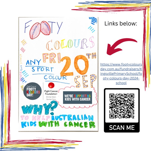 This year, Kingsville Primary School is taking part in Fight Cancer Foundation's Footy Colours Day to help these kids! We’ll be celebrating all things footy and sport on the last day of Term 3, Friday 20th September, so make sure you wear your favourite footy or sports colours to school. Most importantly, we are raising funds to support kids with cancer, and we’re encouraging everyone to dig deep and donate. You can donate online before, during or after our event here: https://www.footycoloursday.com.au/fundraisers/KingsvillePrimarySchool/footy-colours-day-2024-school