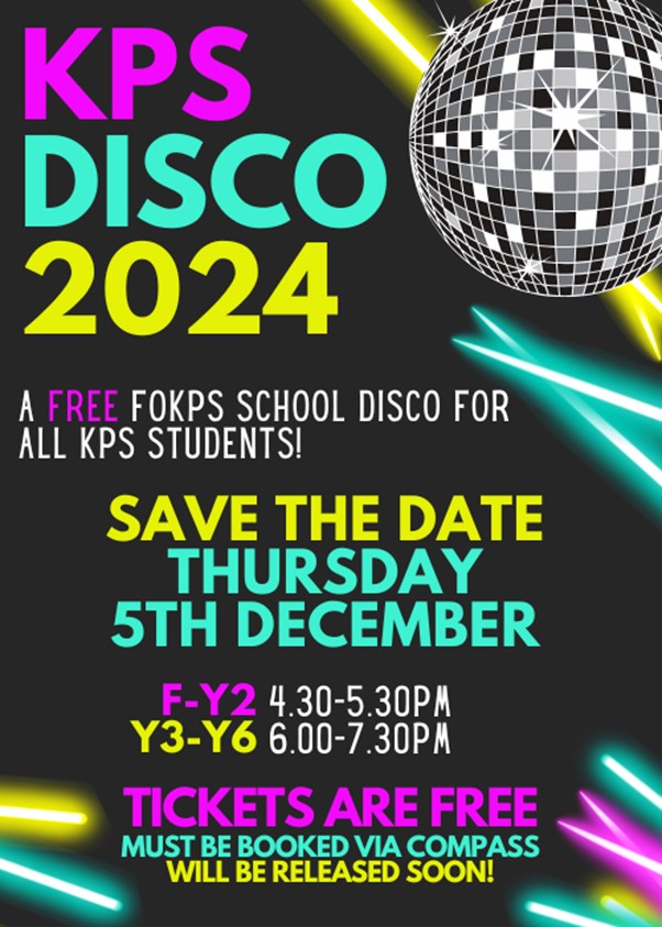 Using funds raised at the 2024 Trivia Night, Friends of KPS are holding a school disco for all KPS Kids – and its free to attend! A compass note will be sent out to all parents shortly – you must confirm attendance if your child would like to attend (we will be checking names at front door, and need exact numbers).