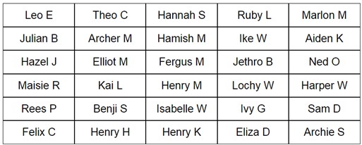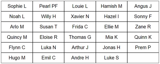 Year 4: Niamh A, Preetam B, Jethro B, Nicholas C, Felix CC, Jake D, Sam D, Hazel F, Henry H, Naysa K, Hendrix L, Fergus M, Jack M, Elliott M, Henry M, Oscar M, George M, Emma N, Ned O, Rees P, Maisie R, Archie S, Jaiden S, Lochy W, Harper W, Isabelle W